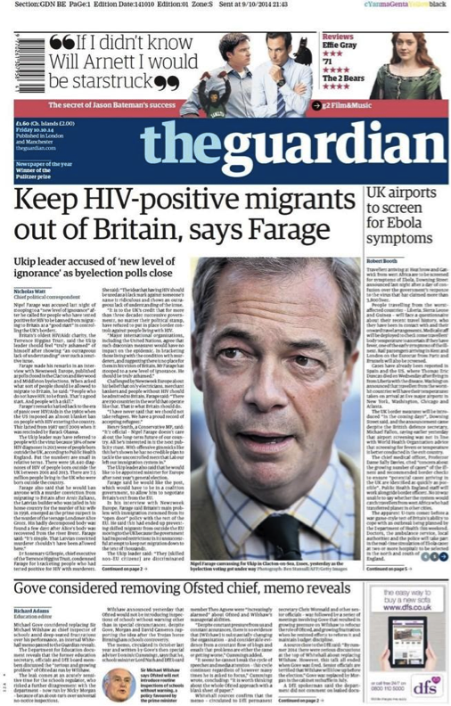 News of the interview spread quickly through broadcast and social media (a Storify sample of twitter responses can be found here). The HIV comments were front-page news in The Guardian on Friday 10th October – “Keep HIV positive migrants out of Britain, Farage says” – and continued to occupy news bulletins some days later. Farage’s views were countered by HIV charities, MP’s, health care professionals and the public. Rosemarie Gillespie, chief executive at the HIV charity, the Terrence Higgins Trust, told the tabloid newspaper the Daily Mail, “In bracketing those living with the condition with murderers and suggesting there is no place for them in his vision of Britain, Mr Farage has stooped to a new level of ignorance. He should be ashamed.”
