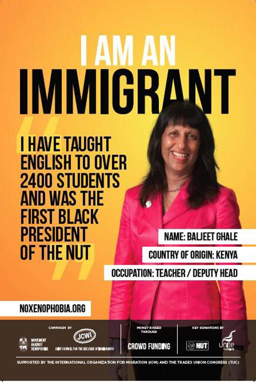 ad_165619435The most direct challenge to the representation of immigration as antithetical to the interests of ‘hard working families’ has been to emphasise the contribution that immigrants have made to the British economy. More recently, the Movement Against Xenophobia (MAX) effectively transported this challenge onto a poster campaign – known by its twitter hashtag #IAmAnImmigrant. This comprises photographs of 15 people from different occupational backgrounds introducing themselves and declaring themselves to be immigrants. The immense popularity of the campaign is evidenced by the fact that over £50,000 was raised within a matter of weeks through crowd funding and led to the posting of 440 images billboards across the underground and 550 at rail stations across the country. Thousands of people have subsequently used the hashtag to retweet photographs of these posters.